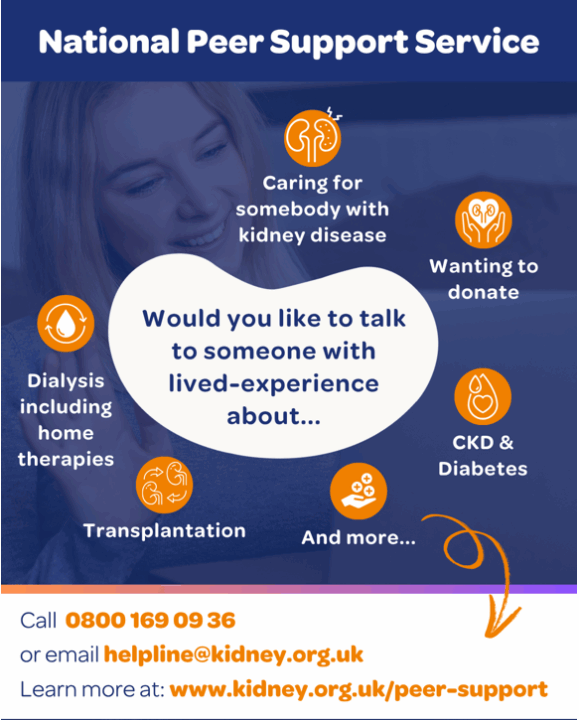 We have a variety of trained peer supporters available, each with different experiences, so you can be matched with someone who relates to your situation. Peers can offer guidance, emotional support, helping you feel more informed, reassured, and less alone on your kidney journey.